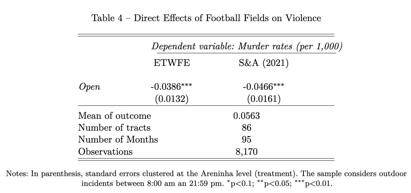 Back-of-envelop calculation shows that the 31 treated areas are having 18.86 fewer homicides every year. Extrapolating the effects to all 102 areas covered by 103 football fields, there are 62.68 fewer murders/year due to this policy. I follow Pereira, Almeida and Oliveira (2020), who attach R$ 1.119 million for a blue-collar Brazilian men