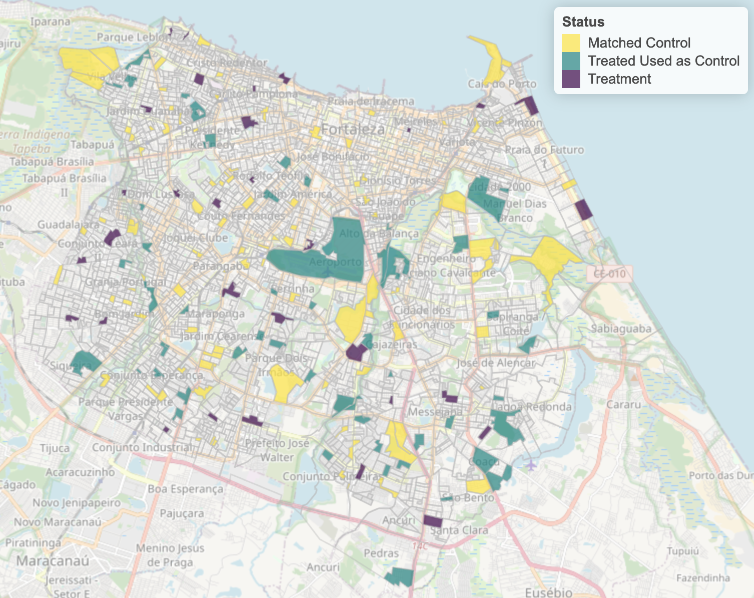To account for endogeneity concerns and evaluate the impact of the Areninhas Project, I combine the difference-in-differences design with a comparison group based on areas treated after the sample final year and/or matched places.