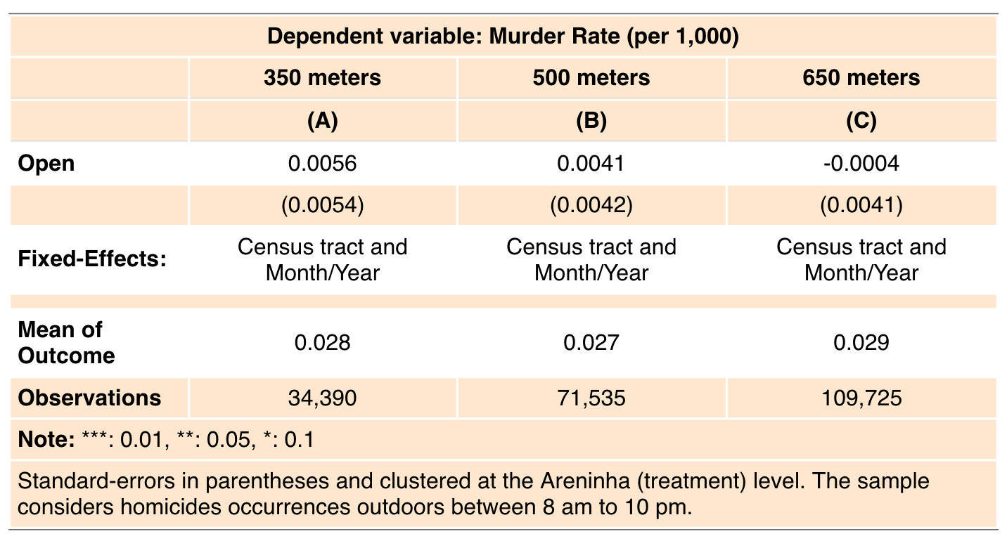 Back-of-envelop calculation shows that the 31 treated areas are having 18.86 fewer homicides every year. Extrapolating the effects to all 102 areas covered by 103 football fields, there are 62.68 fewer murders/year due to this policy. I follow Pereira, Almeida and Oliveira (2020), who attach R$ 1.119 million for a blue-collar Brazilian men