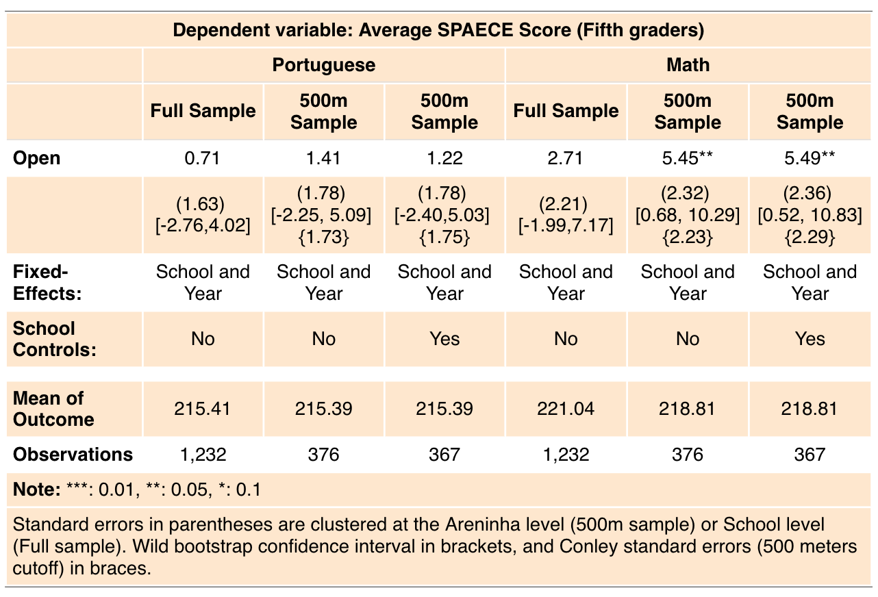 The first three columns display the causal effects of the urban policy on Portuguese scores of students in \(5^{th}\) grade. Results point to an increase of 0.56%, but are not statistically significant