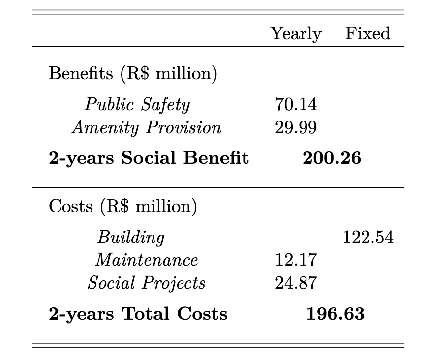 Back-of-envelop calculation shows that the 31 treated areas are having 18.86 fewer homicides every year. Extrapolating the effects to all 102 areas covered by 103 football fields, there are 62.68 fewer murders/year due to this policy. I follow Pereira, Almeida and Oliveira (2020), who attach R$ 1.119 million for a blue-collar Brazilian men