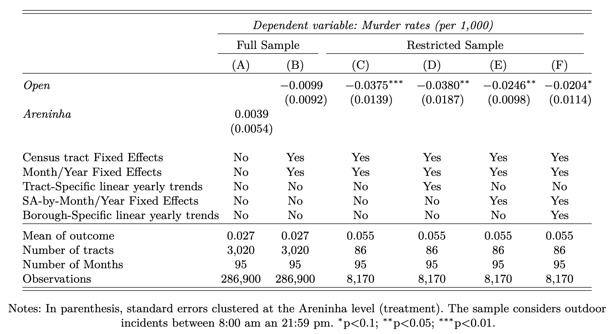 (C) to (F) use the quasi-experimental sample. Results are statistically significant and meaningful: the urban renewal policy caused a decrease in murder rates around 45-68% in treated neighborhoods