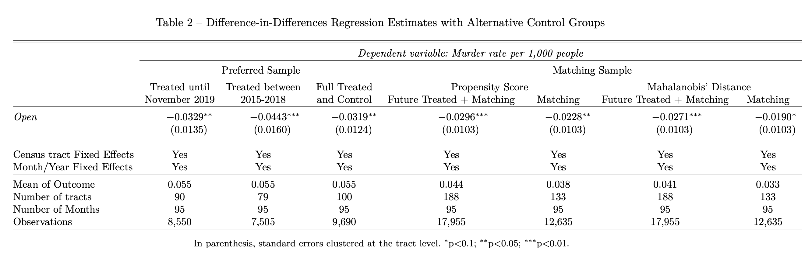 Online Appendix contains results from different control group choices using matching. Results are fairly similar across different samples and point to average murder rates reductions between 57% and 67%