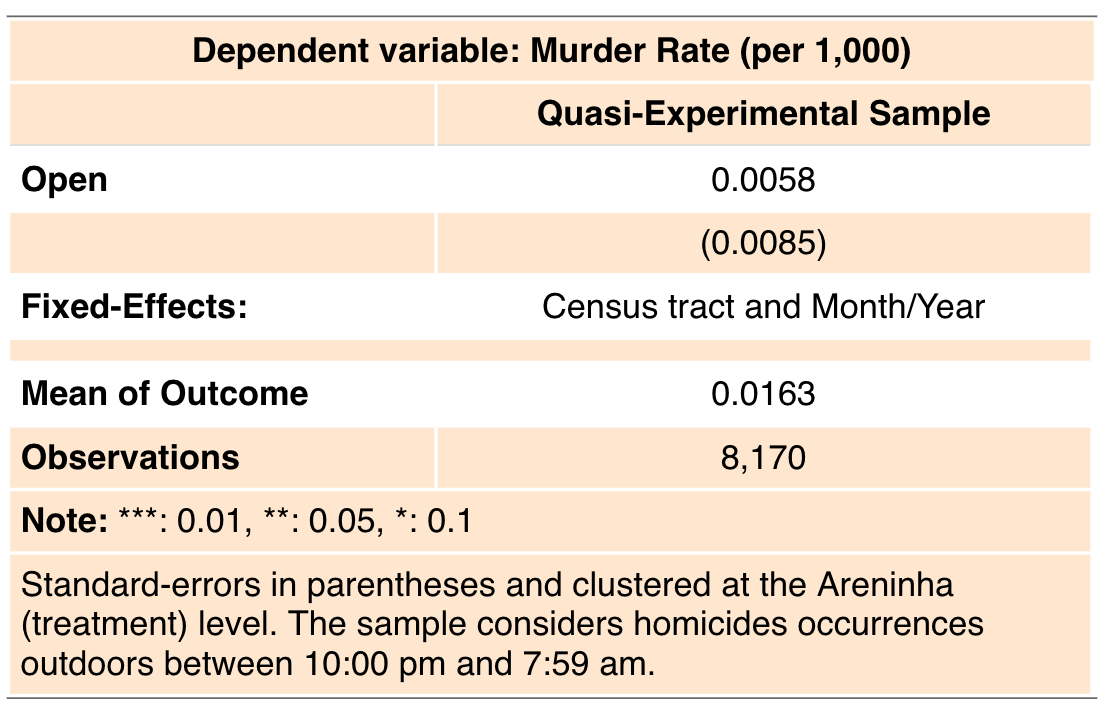 \[\text{Murder Rate}_{iqt}=\lambda_{mt}+\gamma_{i} +\beta_{1}Open:Morning_{imt}+\beta_{2}Open:Afternoon_{imt}+\beta_{3}Open:Night_{imt}+\varepsilon_{imt}\text{ } \text{ } \text{ }\text{ }\text{ } (2)\]