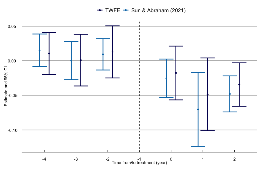 where endpoints are binned at -4 (or less) and 2 (or more). Coefficients are normalized to event time -1
