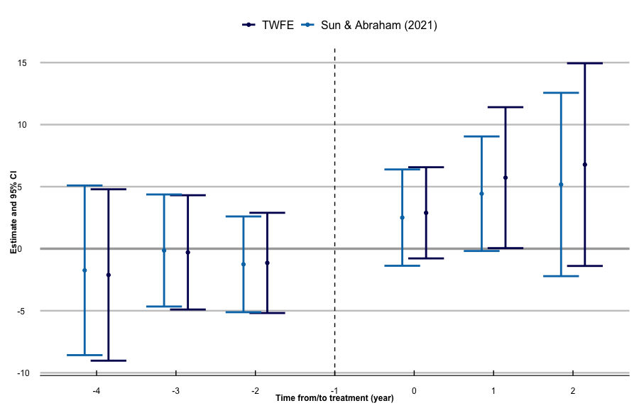 where \(\lambda_{t}\) is the year fixed effect, and \(\gamma_{s}\) refers to School fixed effects. \(\beta\) is the difference-in-differences estimate that captures the causal effect of interest: the extent to which the treated and non-treated Schools differ in their Portuguese and Math average scores.