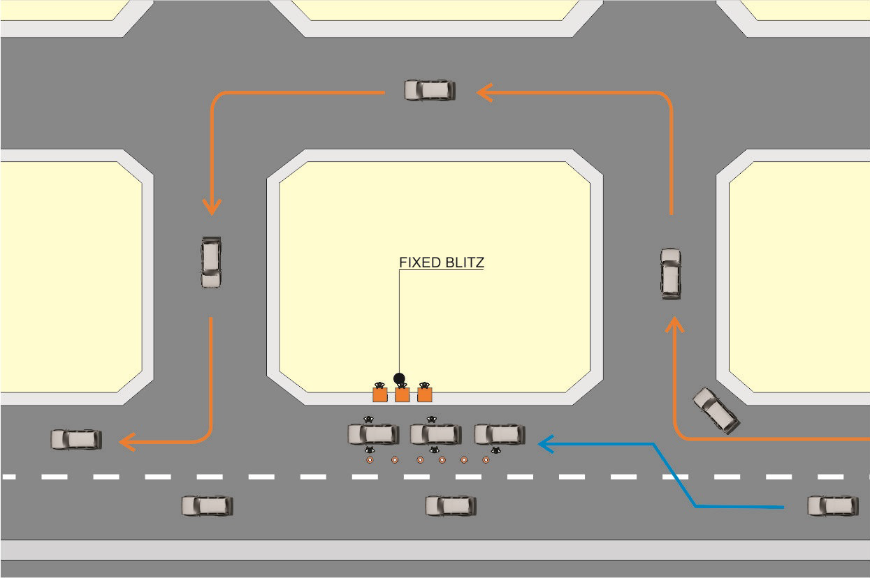 A blitz interrupts the flow of vehicles and people through a physical, visual, and audible warning. Police officers proceed with checks and inspections in selected targets