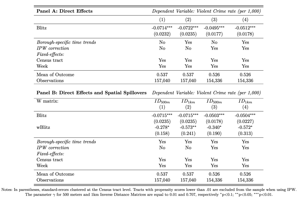 Conditional on time and census tracts fixed effects, the allocation of blitzes in a small area \((0.1 km^{2})\) at a given week is treated as good as random and used to identify the causal effect of local police interventions on crime. For robustness, borough-specific time trends are included and some specifications weight observations with inverse-propensity score (IPW)